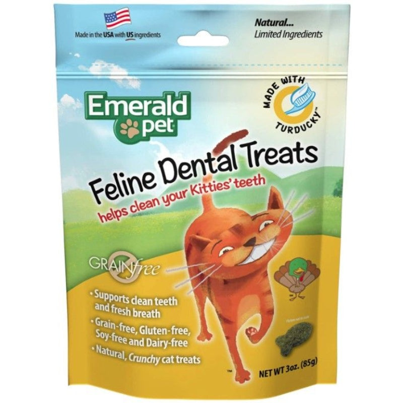 Emerald Pet Feline Dental Treats are the healthy grain-free dental solution your cat will love! These all-natural and nutritious crunchy treats are irresistible to cats. Discerning pet owners will love that theyre grain-free, gluten-free, soy-free, dairy-free, and made in the USA with US ingredients. Whimsical fish-shaped treats are big enough to encourage chewing versus just swallowing for maximum dental health. With innovative ingredients used to fight plaque and tartar, these delicious treats are rewarding for cats and their parents.